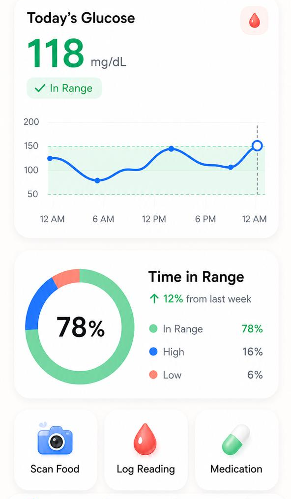 "Eating out used to mean panic. Now I scan the menu, pick the green one, and enjoy dinner. My time-in-range is at 84% for the first time ever."